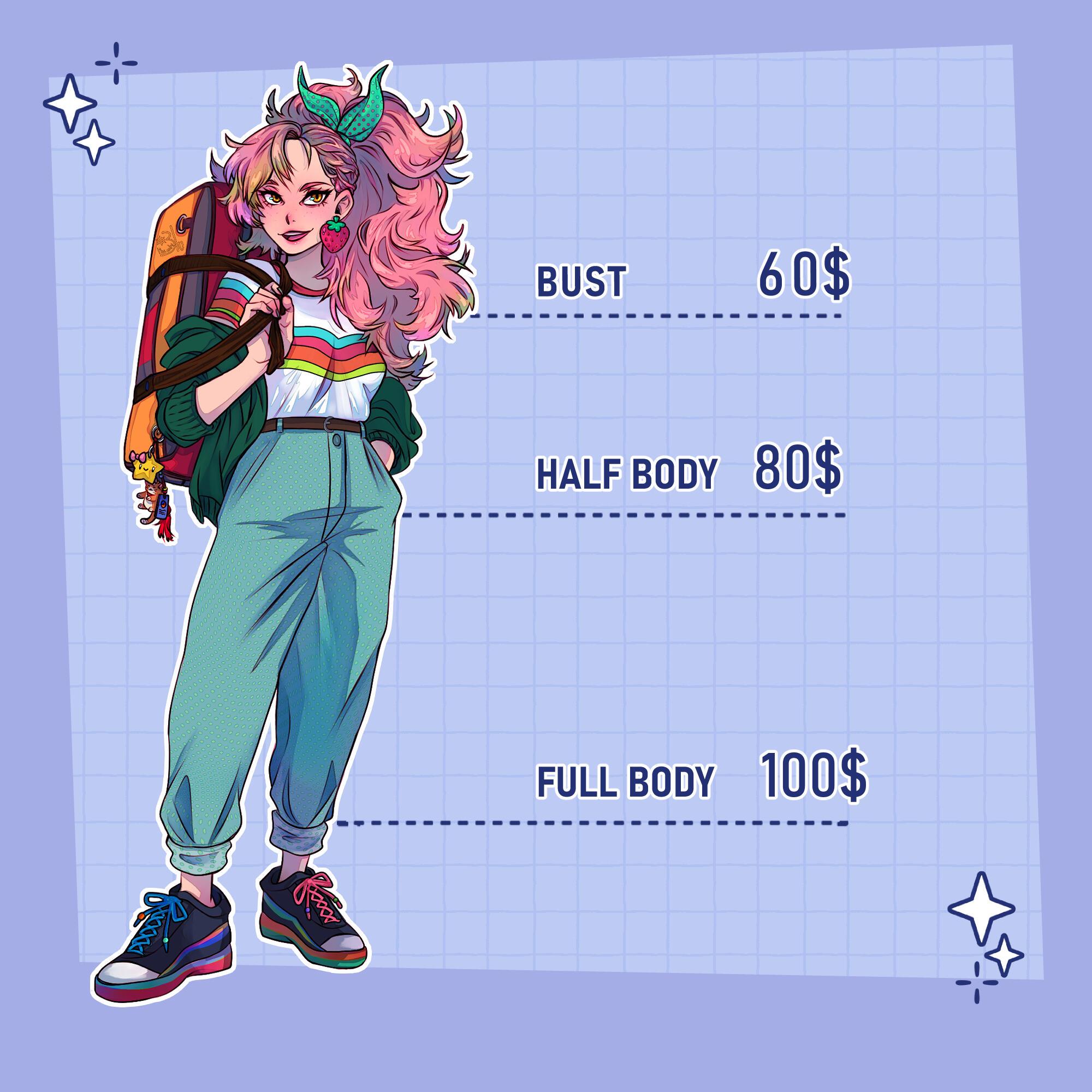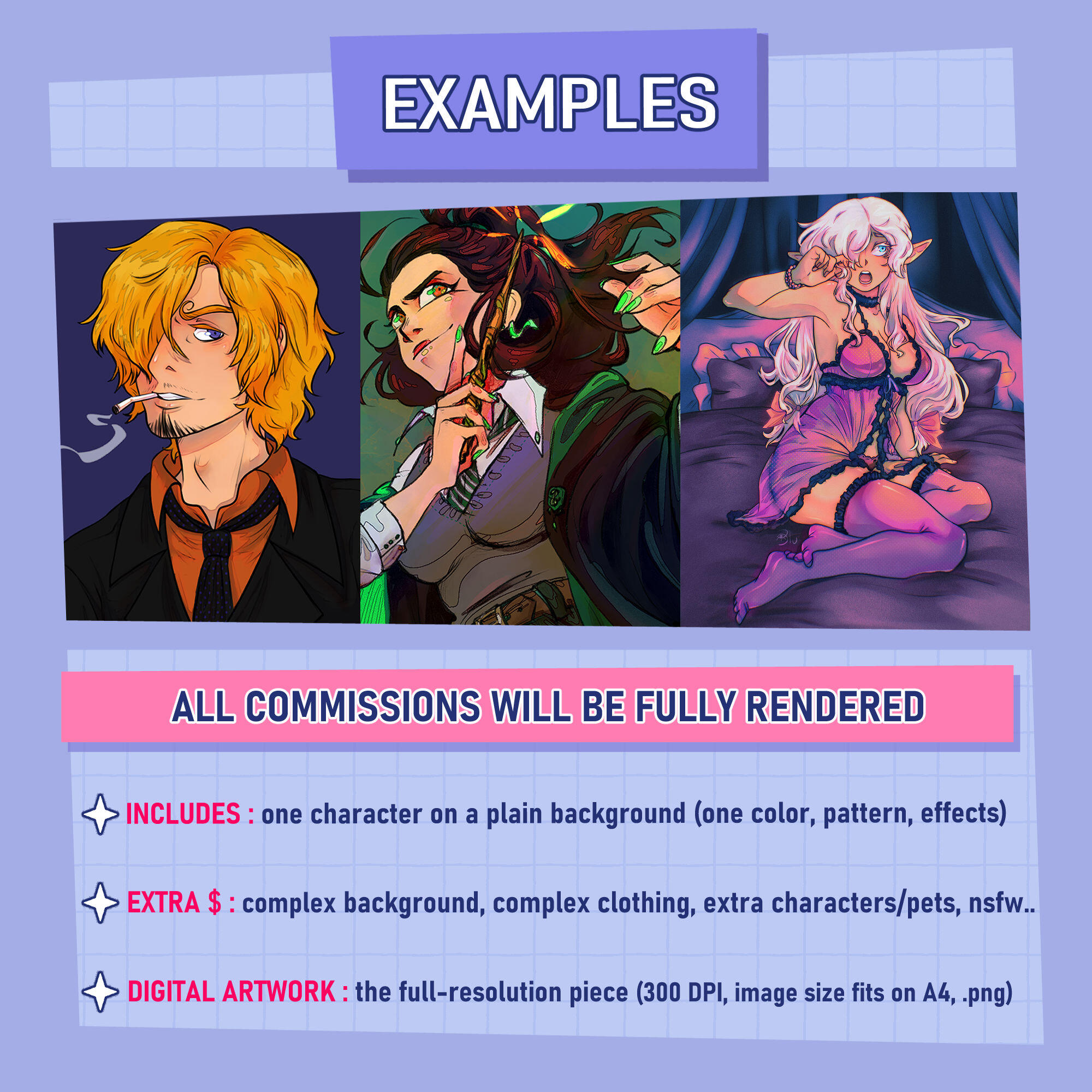 *All prices are base price. If you wish to have a very detailed character, multiple characters, complex background, nsfw art pieces... it will cost some extra.